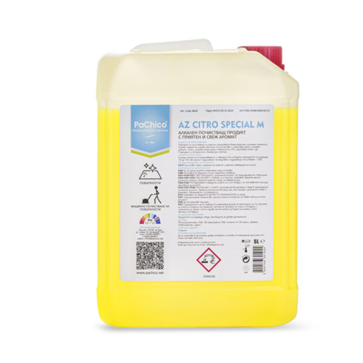 AZ CITRO SPECIAL M е препарат за машинно почистване. Почиства упорити замърсявания върху различни подови повърхности, шлайфан цимент, стени, дограма, емайлирани повърхности, изкуствена кожа. Подходящ е и за алуминий и PVC, благородни метали. Полученият филм предпазва повърхността.