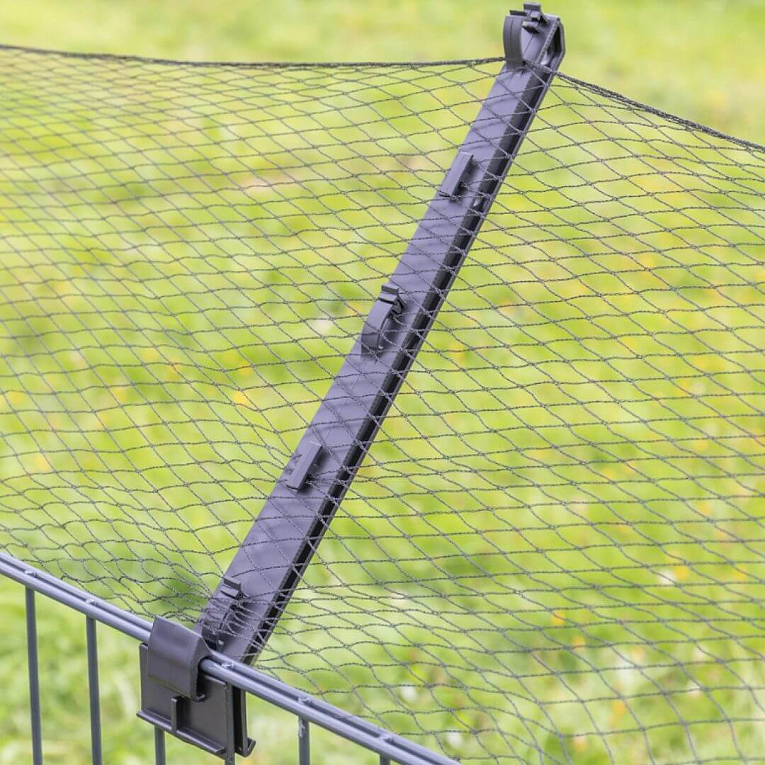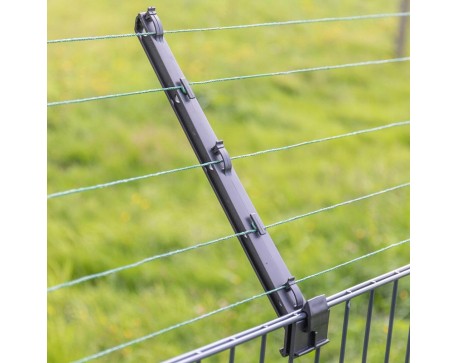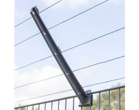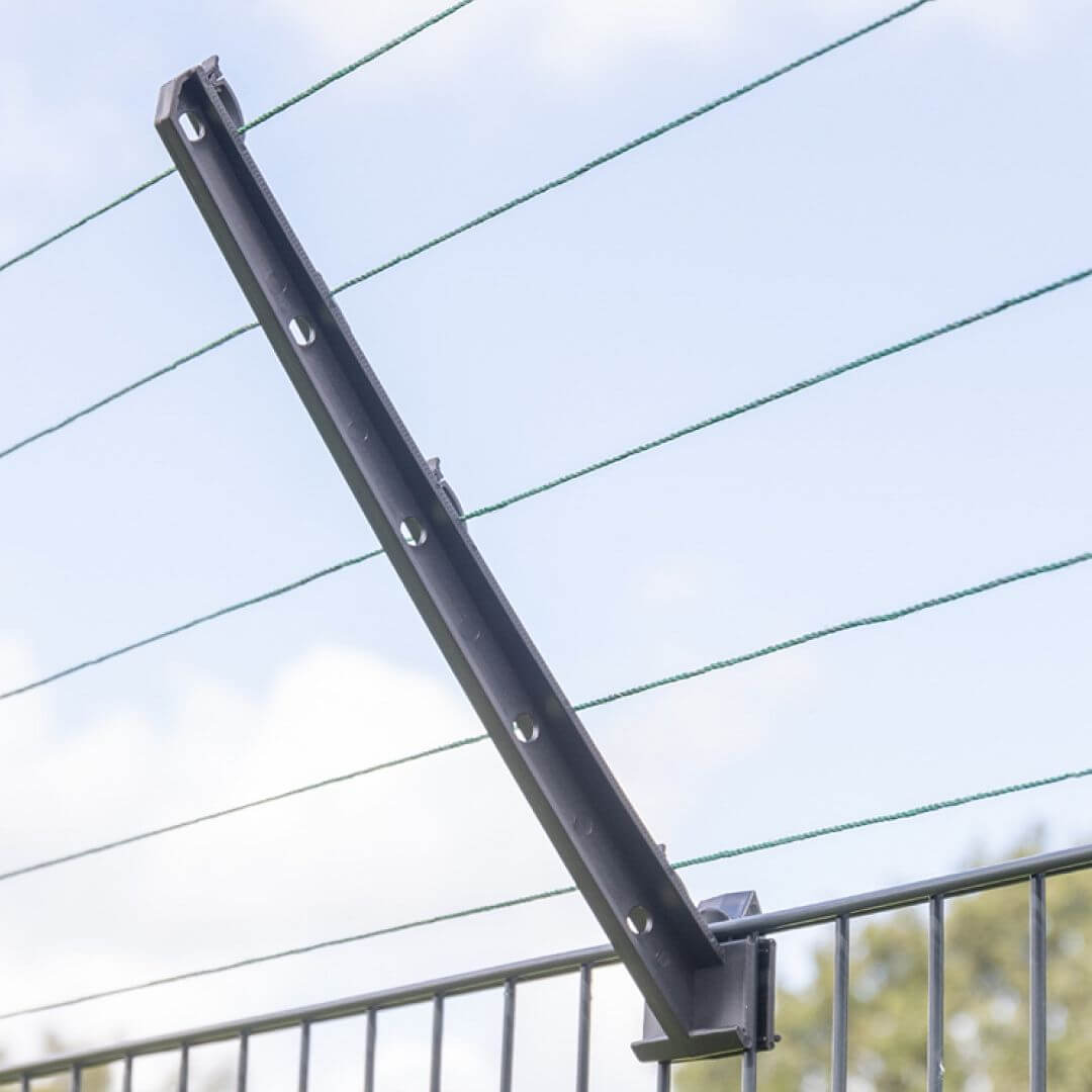 Изолатор за ограда против катерене по различни видове вредители. Общата дължина на рамото е приблизително 40 см и е под ъгъл от 45° градуса . Монтаж без използване на инструменти. Т-образна конструкция за сигурно закрепване. Може да се щракне във всяка част на оградата. Стабилно закрепване.