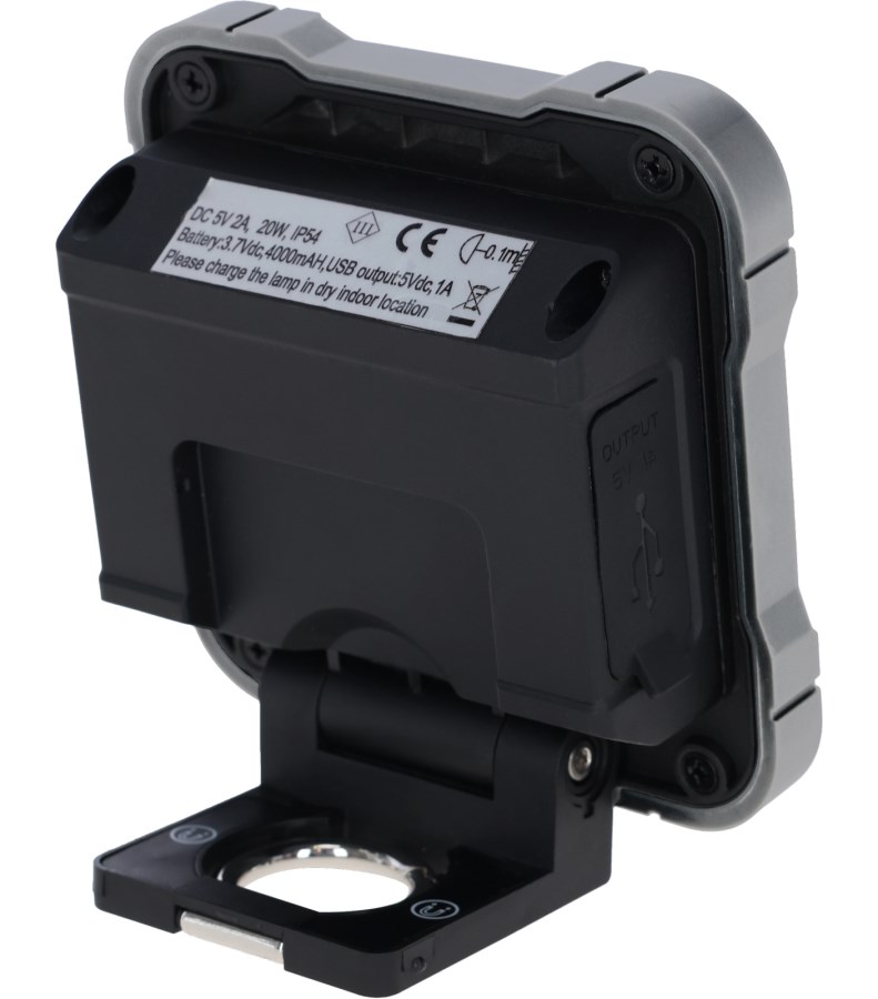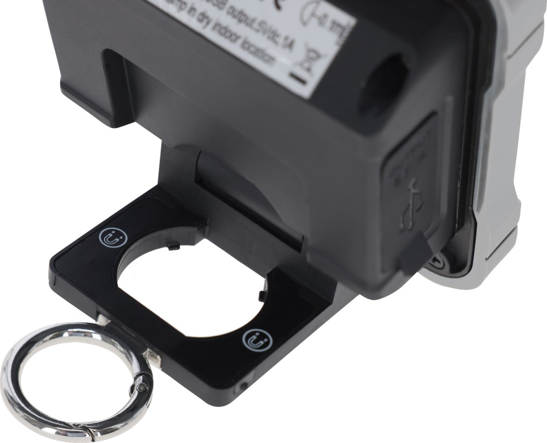Монтаж и удобство: Сгъваемата на 90° стойка и силният магнит позволяват гъвкаво използване като строителен прожектор върху метални повърхности. Благодарение на карабинката е възможна гъвкава монтажна скоба в къщата, градината или при къмпинг.