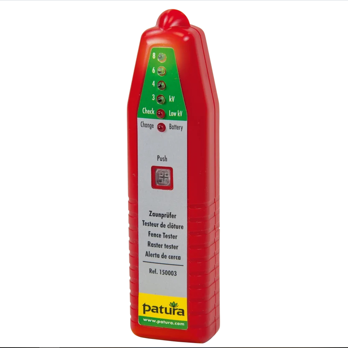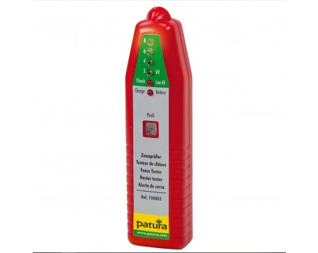 С безжичния тестер за огради от PATURA, напрежението на оградата може лесно да се провери без заземителен кол. Пет ярки светодиода показват състоянието на вашата електрическа ограда: 3000, 4000, 6000 и 8000 волта се потвърждават от зелен светодиод, докато червен светодиод светва, ако напрежението падне под препоръчителния минимум.