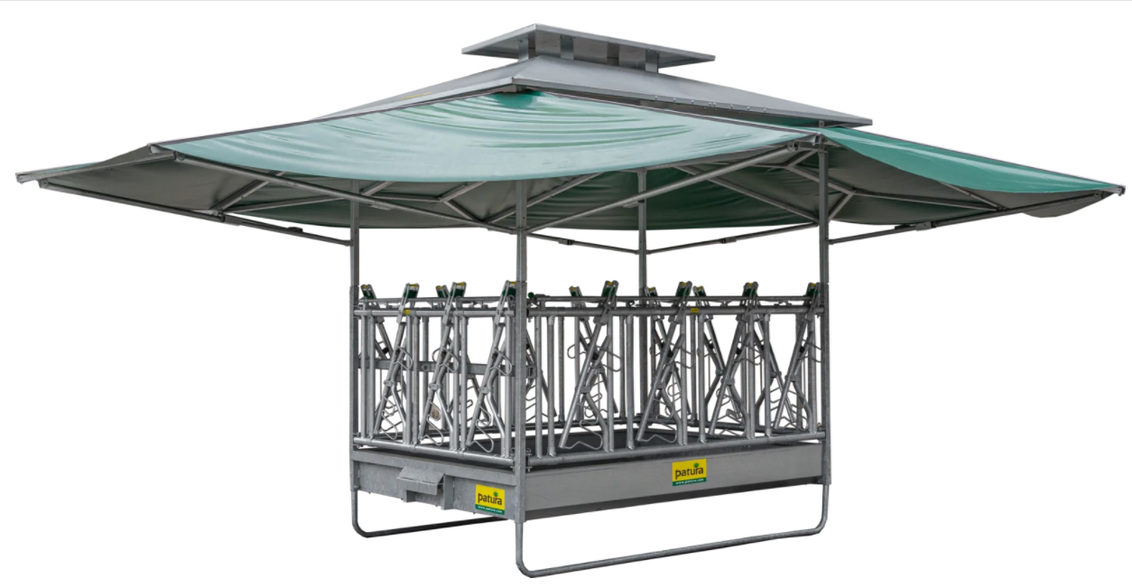 хранилка за големи бали, защитена от атмосферни влияния. Иновативният вариант на покрива се монтира директно върху основната рамка на хранилките. Благодарение на специалната си конструкция, хранилката предлага много голяма покривна повърхност (~ 42 м²) и, благодарение на вградения комин, осигурява приятен охлаждащ ефект. Ефектът на комина винаги създава движение на въздуха, което се възприема като приятно от животните, а също така държи досадните мухи далеч. Това създава привлекателно място за хранене на говеда и коне, като същевременно ги предпазва от пряка слънчева светлина и дъжд.