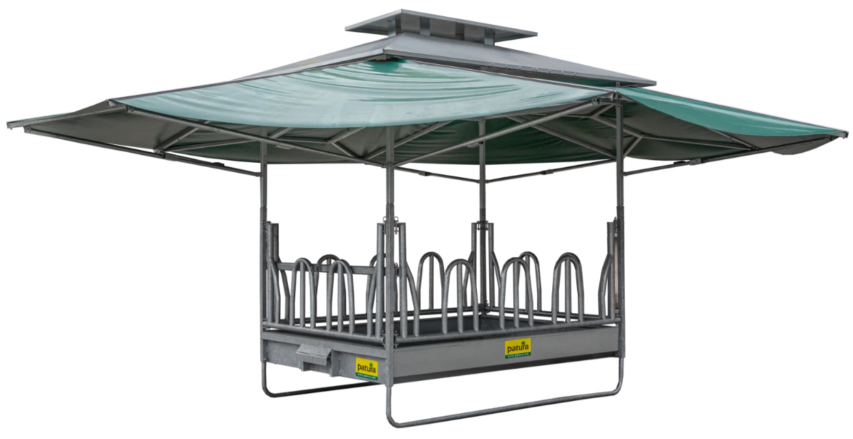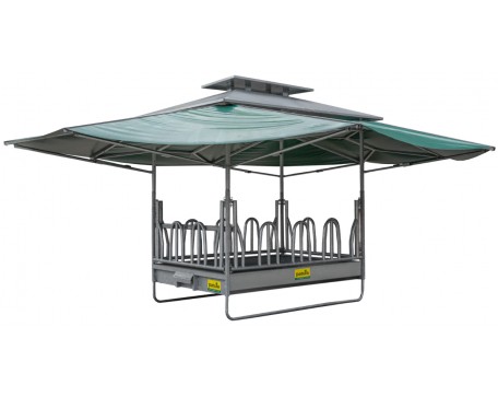 Хранилка за големи бали, защитена от атмосферни влияния.Иновативният вариант на покрива се монтира директно върху основната рамка на хранилките. Благодарение на специалната си конструкция, хранилката предлага много голяма покривна повърхност (~ 42 м²) и, благодарение на вградения комин, осигурява приятен охлаждащ ефект. Ефектът на комина винаги създава движение на въздуха, което се възприема като приятно от животните, а също така държи досадните мухи далеч. Това създава привлекателно място за хранене на говеда и коне, като същевременно ги предпазва от пряка слънчева светлина и дъжд.