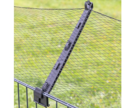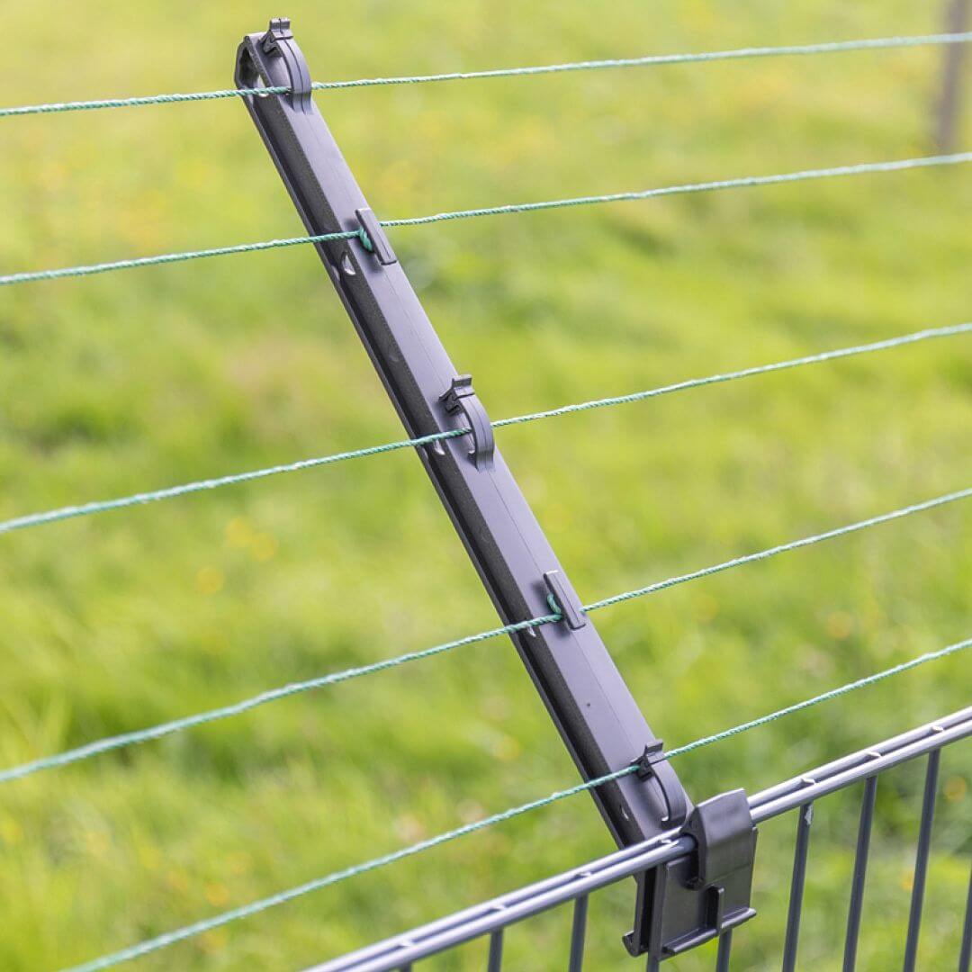 Изолатор за ограда против катерене по различни видове вредители. Общата дължина на рамото е приблизително 40 см и е под ъгъл от 45° градуса . Монтаж без използване на инструменти. Т-образна конструкция за сигурно закрепване. Може да се щракне във всяка част на оградата. Стабилно закрепване.