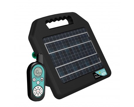 Интелигентен соларен RF генератор с мощност 0.8 J със слънчево зареждане на оградата. Комплектът е с практично дистанционно управление, с което можете удобно да включвате/изключвате захранването на електрическата ограда. Дистанционното има осветен дисплей с цялата важна информация , звукова аларма и получава съобщения за грешки , например при спадане на напрежението в оградата. Може да се зарежда и работи от електрическата мрежа с включения адаптер. Ефективно използване на батерията и режим на пестене на енергия Power-Save.